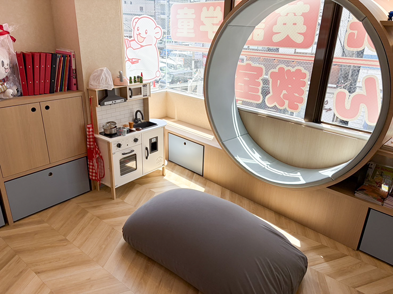 教室には、丸いくつろぎペースやヨギボーを配置し、子どもたちがリラックスできる空間を用意しています。